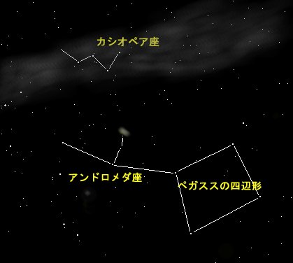 この三つの星がアンドロメダ座で、真ん中の星からカシオペア方向に二つ目の星のあたりにボーッとした雲のようなかたまりが見えるでしょうか? これがお隣の「銀河」、アンドロメダ銀河M31なのです。